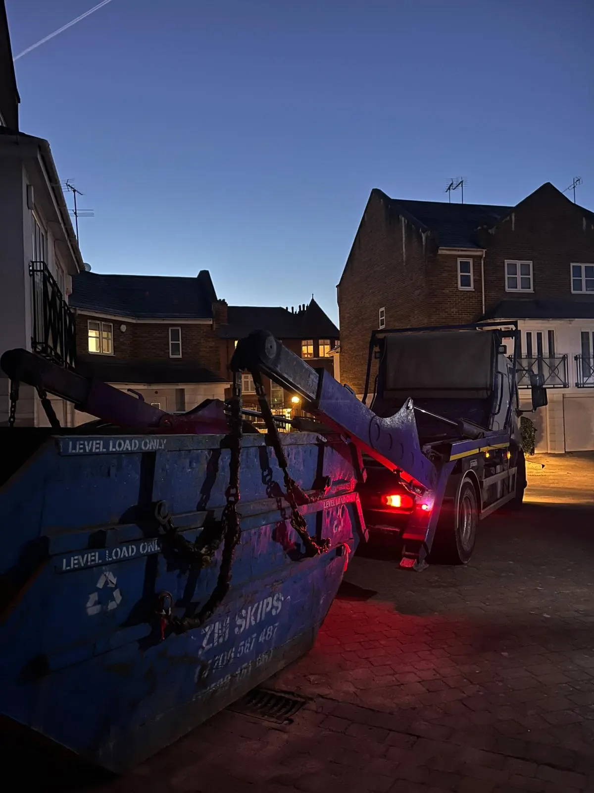 These evening photos show our actual trucks and skips in action at Sipson Road โ not stock images. We operate modern Mercedes vehicles with professional hydraulic skip handling systems, serving residential and commercial clients across West London, including Hayes, Sipson, Harlington, and Heathrow areas.